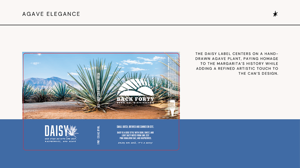 Daisy is a gose inspired by the margarita, brewed with lime zest, agave syrup, pink Himalayan salt, and raspberries for a bright and complex flavor profile. The label design features a hand-drawn agave plant, nodding to the beer’s origins and its playful yet elegant character. From the bold label to the refreshing brew, this project captures the essence of tradition and creativity in one sip-worthy package.