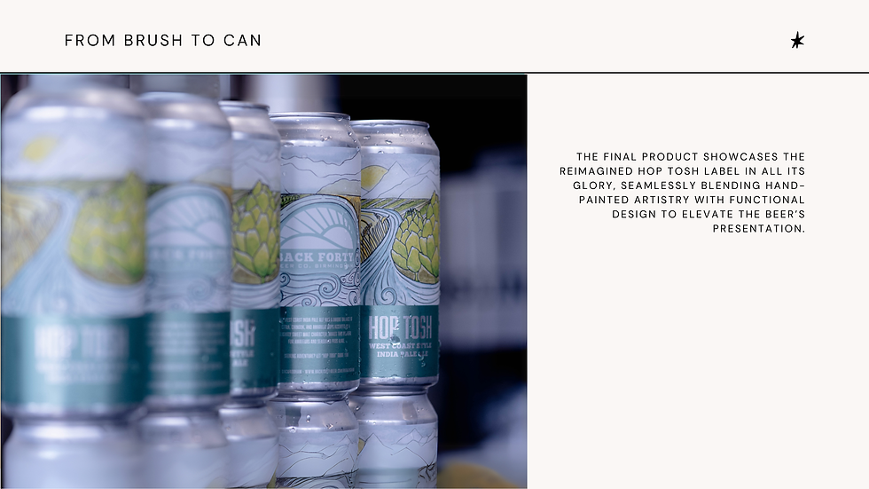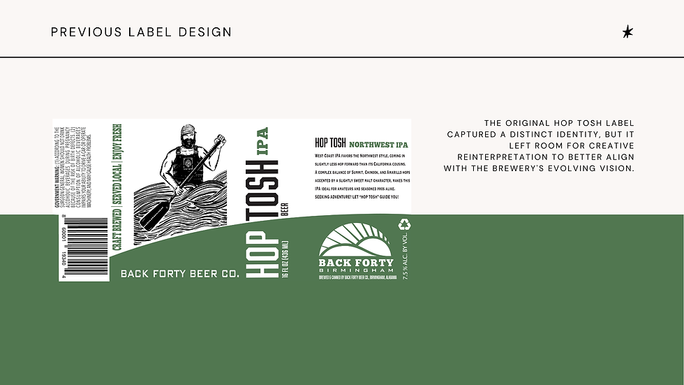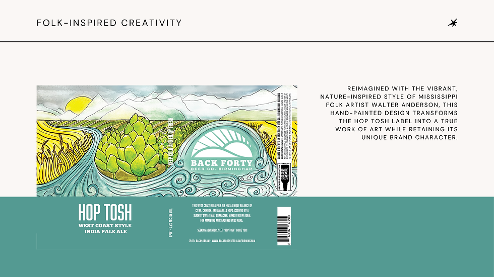 The Hop Tosh beer label redesign drew inspiration from the iconic style of Mississippi folk artist Walter Anderson. This hand-painted label combines bold artistic expression with a cohesive brand vision, bringing a fresh and dynamic look to the Hop Tosh brand.
